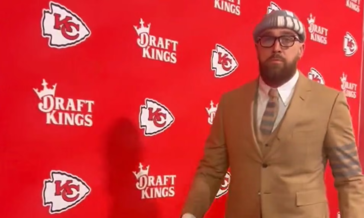 A couple of hours ahead of kickoff, the tight end was seen wandering into Arrowhead wearing a bizarre brown suit and grey beanie. His tie, suit and beanie all featured four stripes in apparent nod to his bid for a fourth Super Bowl.