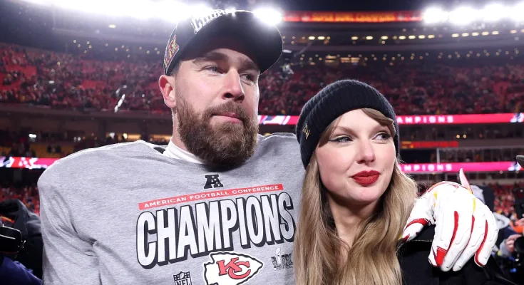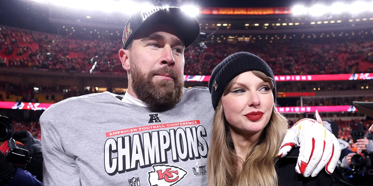 Taylor Swift celebrates with Travis Kelce after defeating the Buffalo Bills 32-29 in the AFC Championship Game at GEHA Field at Arrowhead Stadium in Kansas City, Missouri, on January 26, 2025 | Source: Getty Images
