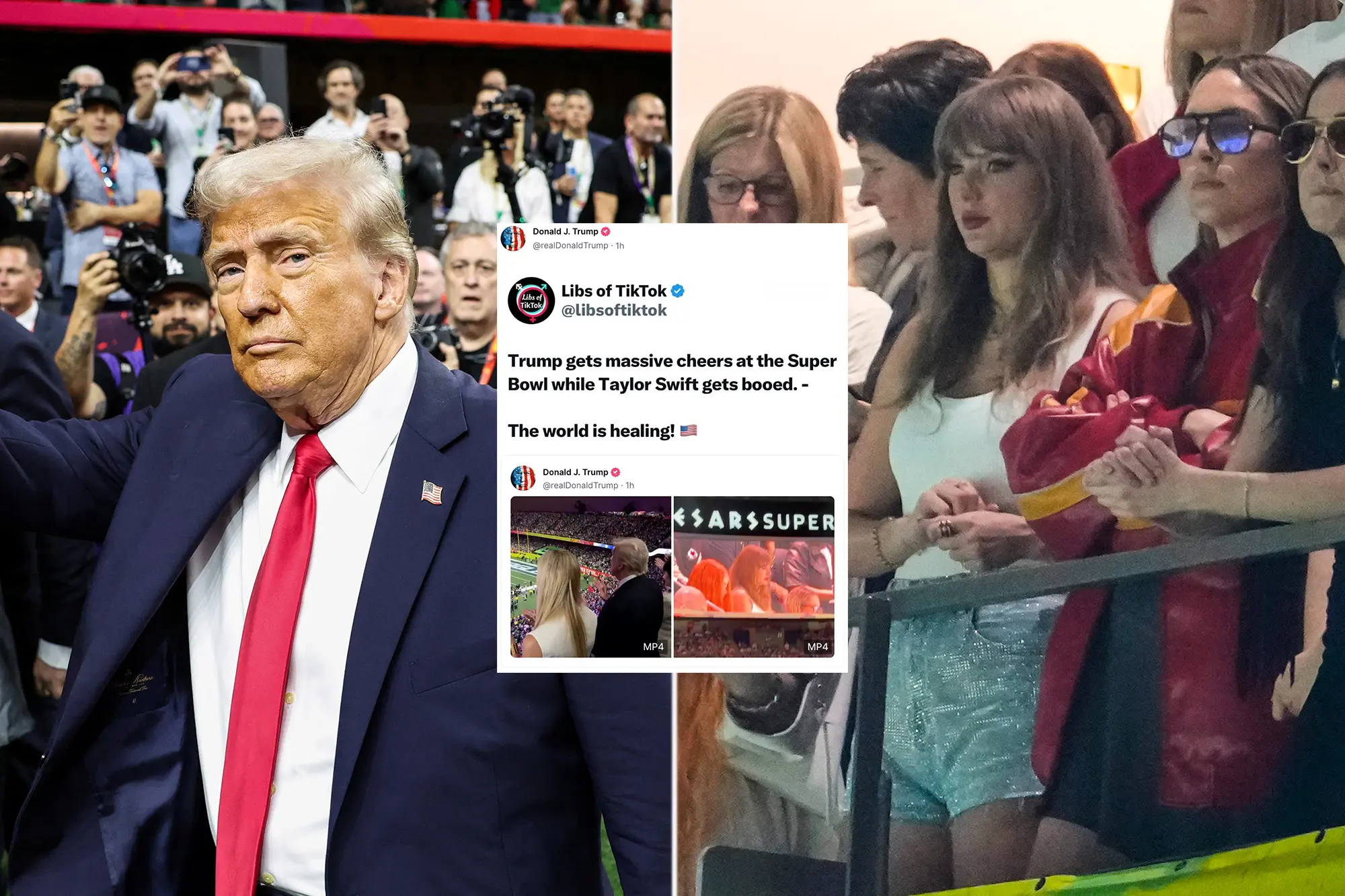He shared another user’s post with the caption: ‘Trump gets massive cheers at the Super Bowl while Taylor Swift gets booed.’