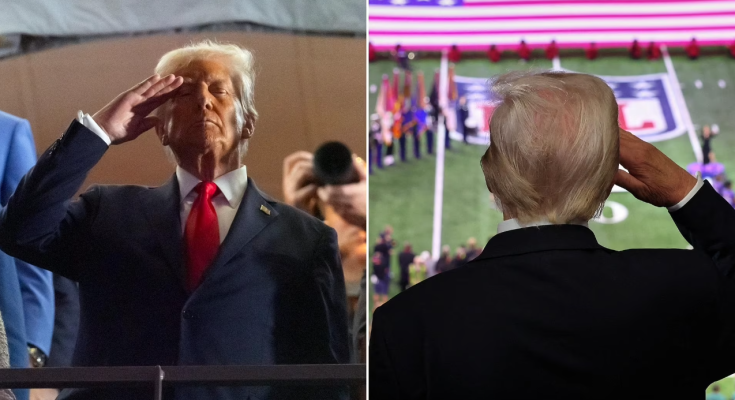 Fox’s broadcast of the Philadelphia Eagles’ win over the Kansas City Chiefs included a shot of Donald Trump saluting the crowd during the playing of the national anthem – the same image that was shown to the crowd on the Superdome jumbotron.