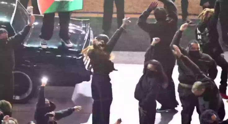 The man began his stunt while standing on a car which was part of the rapper’s elaborate set up, before leaping off the bonnet and fleeing from the stage when security attempted to catch up with him.