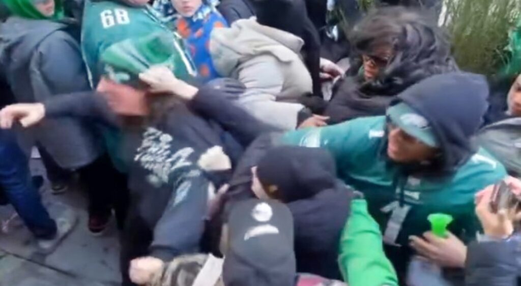 As Eagles fans packed the streets of Philadelphia for the big celebration, cameras caught several attendees exchanging punches in a heated altercation. Making this extra bizarre and concerning? One of the fans involved in the scrum was holding a baby: