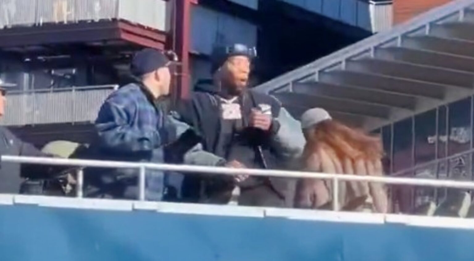 At Super Bowl parades, it’s common for fans to throw canned drinks for the players to catch while they ride the team bus. But Saquon Barkley missed this dart from a fan, and it wound up doinking the back of the head of a person standing behind him: