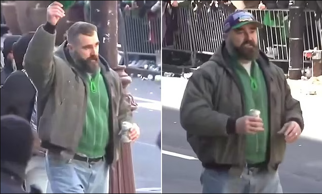 A boozy Jason Kelce was seen arriving at the Eagles parade beer in hand as he prepares to toast their Super Bowl triumph with supporters in Philadelphia.