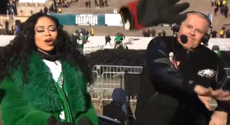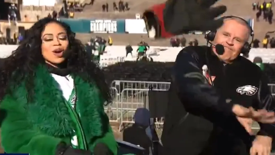 Except for one newscaster, Mike Jerrick, who was reporting live for Fox 29 from the parade site with red gloves. His co-host, Alex Holley, addressed the gloves and asked him to explain himself, given that red is the color of the Eagles opponent in Super Bowl LIX: the Kansas City Chiefs. Jerrick explained they are electric, heated gloves, necessary on a frigid day in the city.