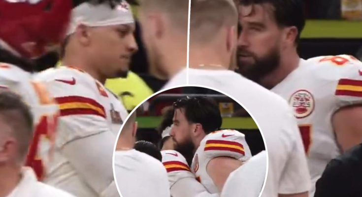 Travis Kelce and Patrick Mahomes shared an emotional moment on the sidelines after their devastating Super Bowl 2025 loss.