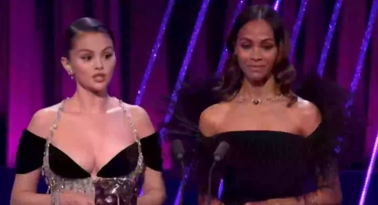 Gomez came up to present alongside Zoe Saldana, her Emilia Perez co-star, who herself made headlines for a swearing-filled acceptance speech that the BBC cut parts of for their broadcast.