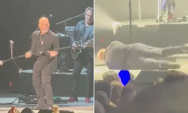 Billy was performing his song It’s Still Rock and Roll to Me when he stumbled backwards and fell on his back, prompting gasps from the audience.