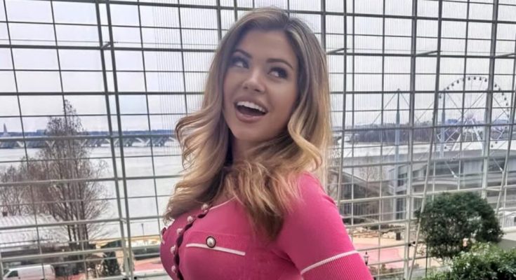 Natalie Winters was back at it again this month when she posted a picture of herself outside of the White House wearing a blue suit and a low-cut white top.