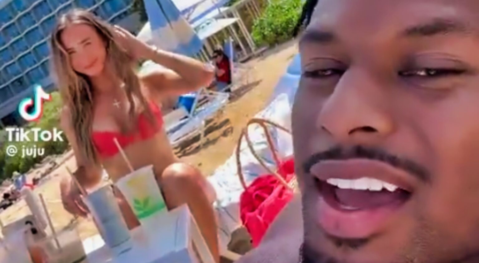 In the video, JuJu is seen on a beach chair, mouthing the words to a song while his fiancee sits in the background. The scene then shifts to his soon-tobe-wife doing a dance near the water while rocking a two-piece bikini.
