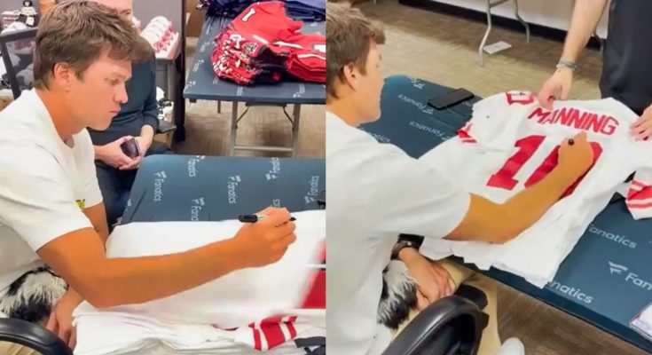 Former NFL quarterback Tom Brady has gone viral once again after writing a priceless two-word message on a fan’s Eli Manning jersey.