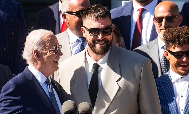 In 2023, Kelce wore a bold red suit as he and Mahomes presented Biden with a personalized Chiefs jersey.