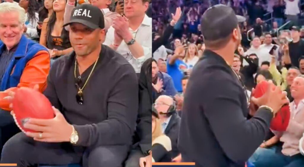 One day after signing his contract with the Giants, Russell Wilson wasted no time making his first public appearance with the club. The Knicks posted a video of Wilson signing a football and throwing it into the crowd for a lucky fan to snag: