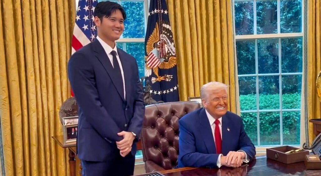 After the United States President got the formalities out of the way, with speeches and such taking place, he took the team to the Oval Office, where he strangely made Ohtani take a photo next to the Declaration of Independence.