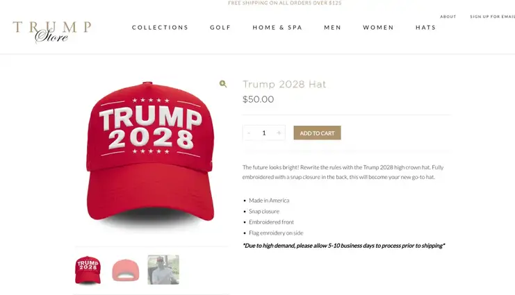 The clothing item shows Trump’s familiar red cap with the text ‘Trump 2028’ on the front.