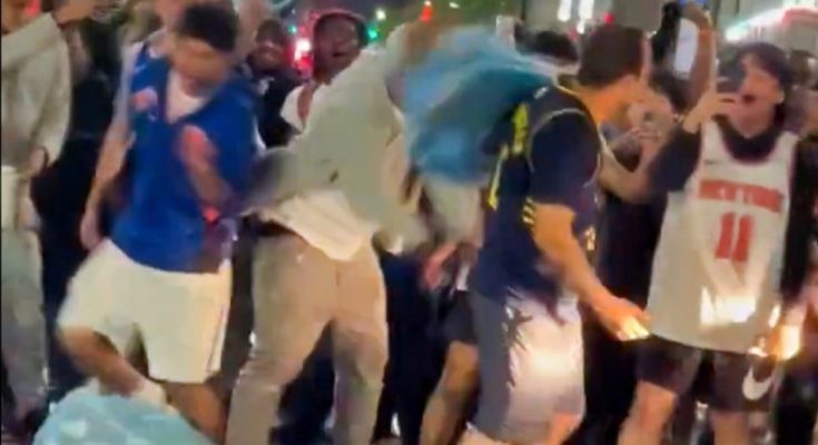 An Indiana Pacers fan wearing a Tyrese Haliburton jersey found himself sorely outnumbered against a group of New York Knicks supporters on Friday night after NY booked their ticket to the Eastern Conference Finals.