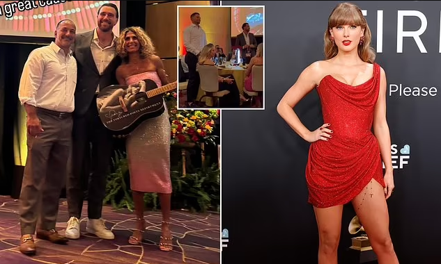 Kansas City Chiefs star Travis Kelce posed with the fans who bought the acoustic guitar signed by his girlfriend, Taylor Swift, which was donated for Patrick Mahomes‘ charity auction.