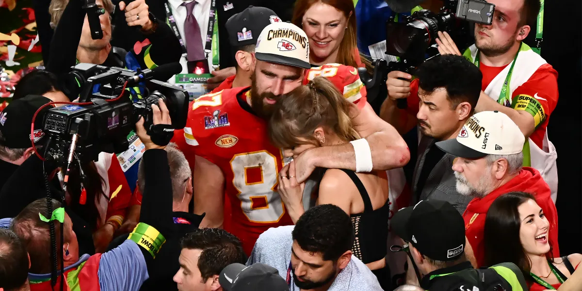 As a staff member held the door open, the couple made their way out to a wave of cheers from nearby fans. Holding hands, they embraced the attention, with Kelce flashing a smile and calling out, “Hey guys!” as he casually ran a hand through his hair.