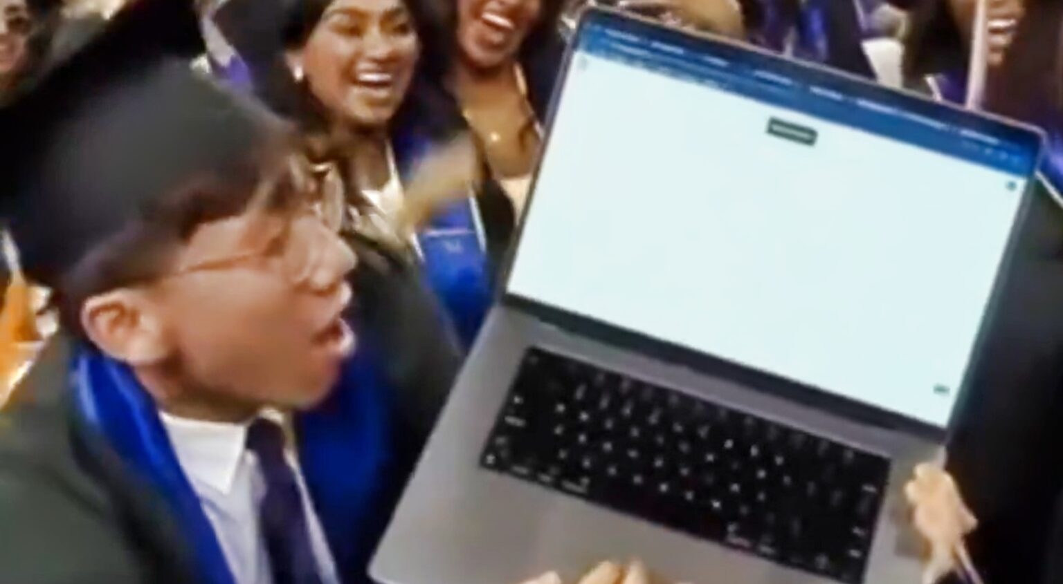 As far as graduation stunts go, this has to be in the top five. Pulling out a computer to let everyone know that you didn’t do the heavy lifting on your assignments right before walking across that stage is surely one of the most audacious moves a student could pull off.