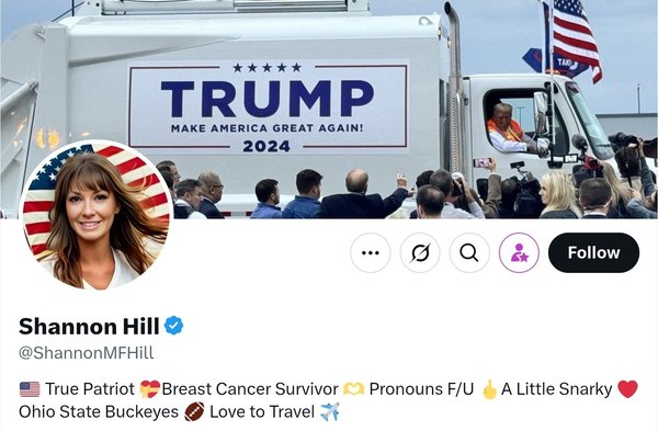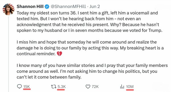 People like Shannon Hill (@ShannonMFHill) who lamented on X about her son cutting off contact over her Trump worship—something prominently displayed on her X profile.