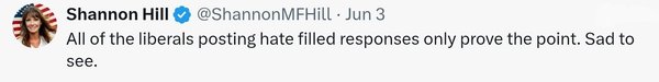 “All of the liberals posting hate filled responses only prove the point. Sad to see.”