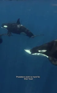 “Orcas don’t just hunt together, they share their food too. These intelligent apex predators have been seen dividing prey among pod members and even offering leftovers to humans,” she began.