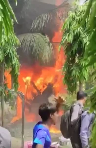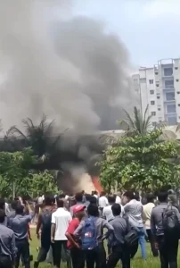 “[The plane] crashed into the primary school building, around 100-150 meters away from us. The pilot ejected from the plane with a parachute and got down while the primary school building caught fire,” student Naimul Hasan Adit told TBS.