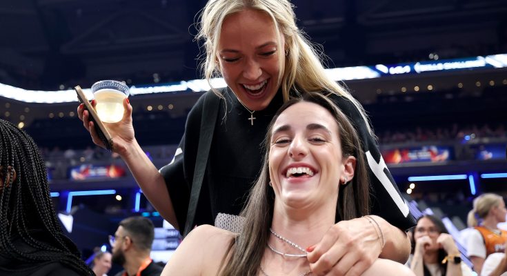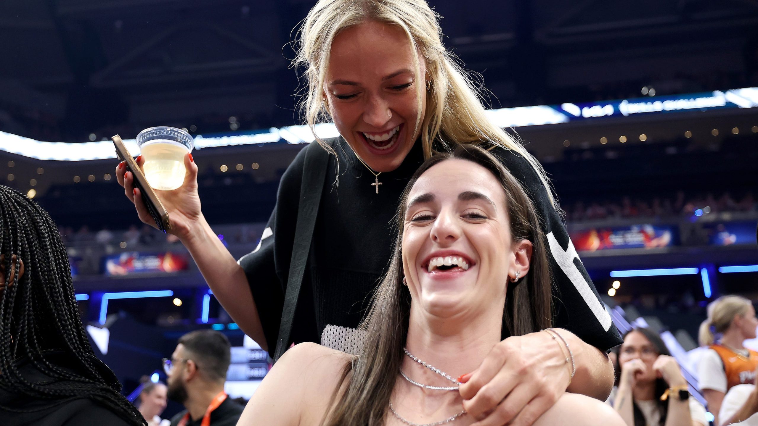INDIANAPOLIS, INDIANA – JULY 18: Sophie Cunningham and Caitlin Clark of the Indiana Fever pose and cheer for teammate Lexie Hull in the Kia WNBA Skills Challenge during the 2025 AT&T WNBA All-Star weekend at Gainbridge Fieldhouse on July 18, 2025 in Indianapolis, Indiana.