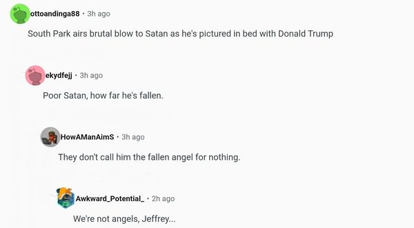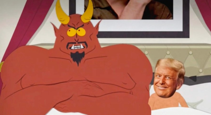 Longtime fans of the show will be disappointed to learn Satan—yes, King of Hell Satan—has gone back to another man who’s no good for him. Satan left Saddam Hussein—an abusive and manipulative partner—with the help of Kenny in the movie South Park: Bigger, Longer & Uncut. After his relationship with gentle, caring Chris ended, Satan has gone back to another narcissistic liar—Donald Trump.