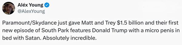 But it was their $16 million deal to pay off a Trump nuisance lawsuit against CBS and 60 Minutes—largely mocked as a bribe or coercion to get FCC approval for a Paramount/Skydance deal—that got into the season premiere episode.