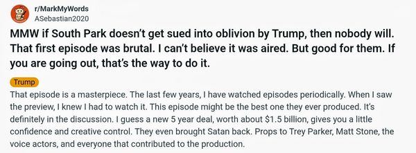 While the humor of Parker and Stone may not be everyone’s cup of tea, the episode got high marks on Reddit.