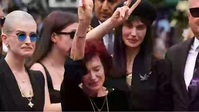 Sharon and her children gathered to pay tribute to Ozzy, with the widow showing two peace signs (Loannis Alexopoulos/Anadolu via Getty Images)