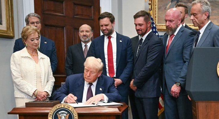 Trump signed the executive order Thursday afternoon where surrounded by several athletes, including Kansas City Chiefs’ kicker Harrison Butker; professional golfer Bryson DeChambeau; Chief Content Officer of the WWE and son-in-law of Education Secretary Linda McMahon, Paul “Triple H” Levesque; and former New York Giants linebacker Lawrence Taylor, a registered sex offender.