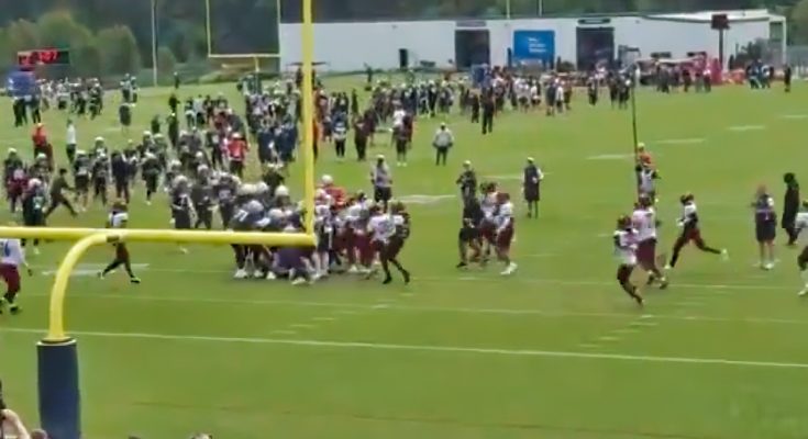 According to the Boston Herald’s Zack Cox, Vrabel tried to break up a scrum between Patriots rookie running back TreVeyon Henderson and a Commanders edge rusher.