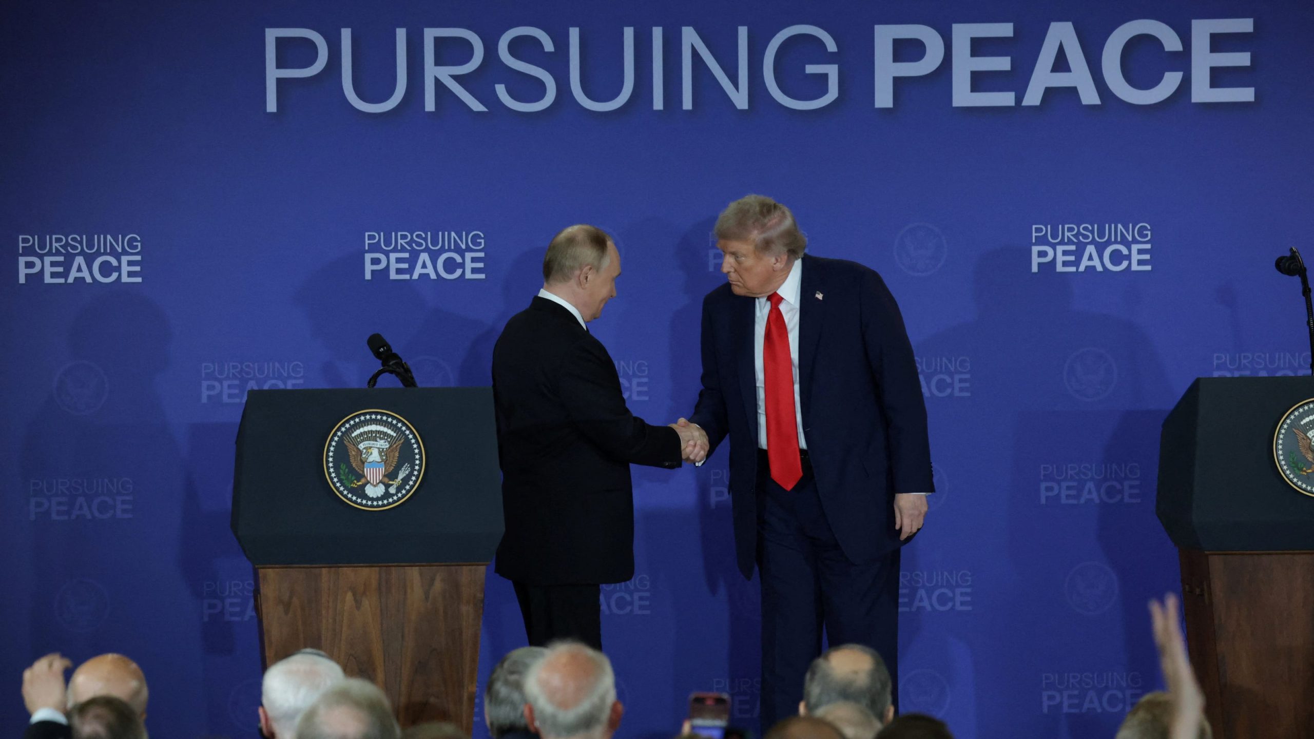 Trump and Putin sat next to one another, tilted forward with their hands between their legs, in front of a dark blue banner that said “Pursuing Peace” and “Alaska 2025.”