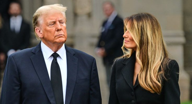 Photographed from a slightly low angle, Donald and Melania stand hand-in-hand with a composed presence. The perspective emphasizes their posture and height.