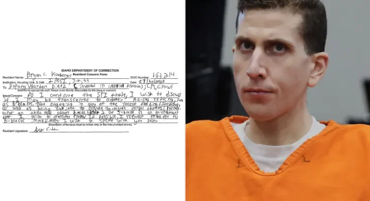 “Not engaging in any of the recent flooding/striking as well as being subject to minute-by-minute verbal threats/harassment and on that and other bases [sic] Unit 2 of J-Block is an environment that I wish to transfer from,” Kohberger wrote in his note, a copy of which was obtained by PEOPLE. (Flooding refers to inmates intentionally causing water to overflow in their cells as a form of disruption.)