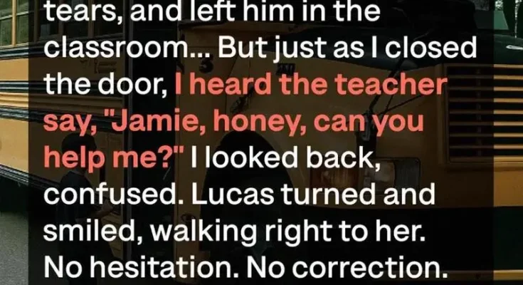I walked Lucas in alone, and as I returned with his water bottle, I overheard his teacher warmly calling him “Jamie.”