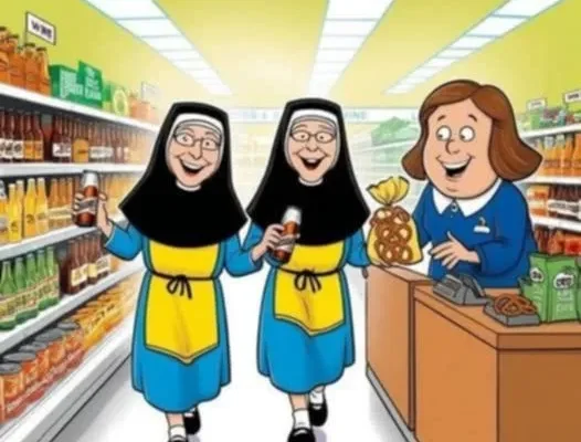 The cashier paused for a moment, then smiled knowingly. Without missing a beat, he reached under the counter, pulled out a small package of pretzel sticks, and casually placed them in the bag with the beer. Then, looking the nun straight in the eye, he added with a wink, “The curlers are on the house.” Both nuns chuckled quietly, exchanging amused glances, as they left the store, satisfied that their little joke had gone over perfectly.