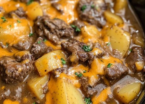 - Combine & Layer in Slow Cooker: Transfer the browned beef mixture to a 6-quart slow cooker. Add the 1 can of condensed cream of mushroom soup, 1 cup whole milk, 1 teaspoon kosher salt, ½ teaspoon black pepper, and 1 tablespoon Worcestershire sauce. Stir everything well to combine. Arrange a layer of the 4 cups of thinly sliced potatoes over the beef mixture, overlapping them slightly. Repeat these layers with the remaining beef mixture and potatoes.