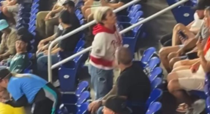 A new video has surfaced of the Philadelphia Phillies’ “Karen” fan who created a scene after making a man give up Harrison Bader’s home run ball that he obtained for his son in last night’s game against the Miami Marlins.