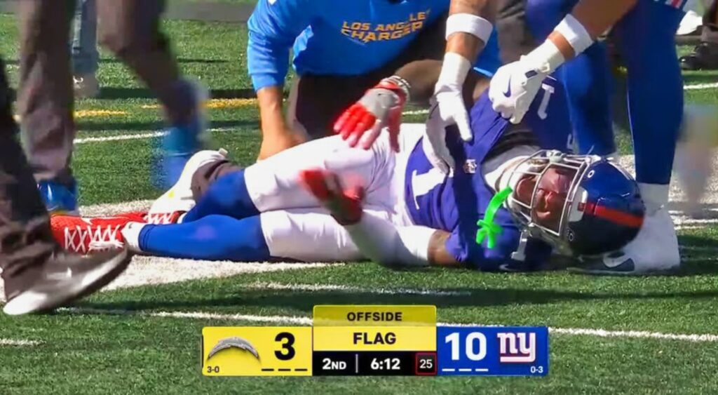 With just over six minutes remaining in the quarter, Giants rookie quarterback Jaxson Dart (making his NFL debut) tried to connect with Malik Nabers on a deep ball. Nabers fell to the ground and immediately grabbed his right knee: