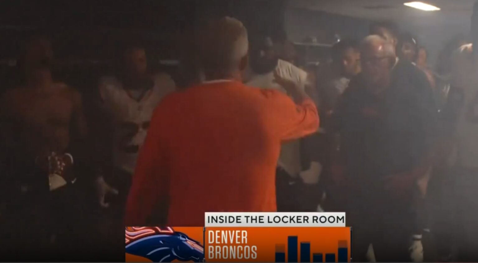 As the Denver Broncos head coach spoke, the locker room looked as if it were on fire, with smoke everywhere.