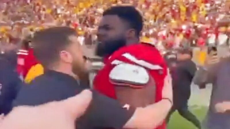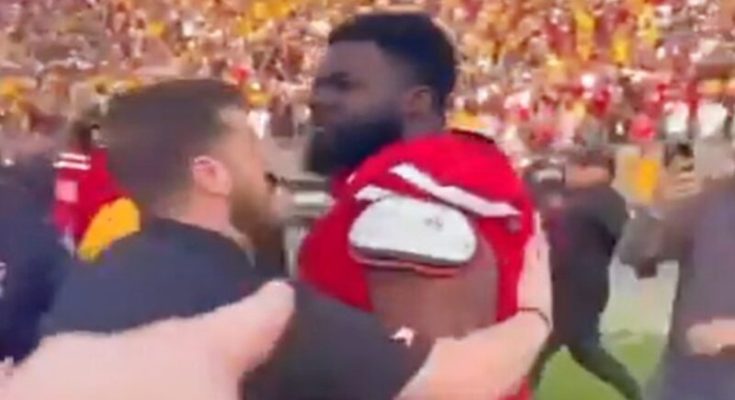 In the video below, Texas Tech Red Raiders defensive lineman Lee Hunter and wide receiver Bryson Jones can be seen exchanging words with Arizona State fans who stormed the field after the game. Hunter even takes a swipe at one of the ASU fans: