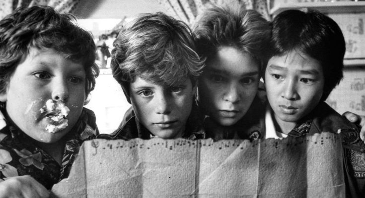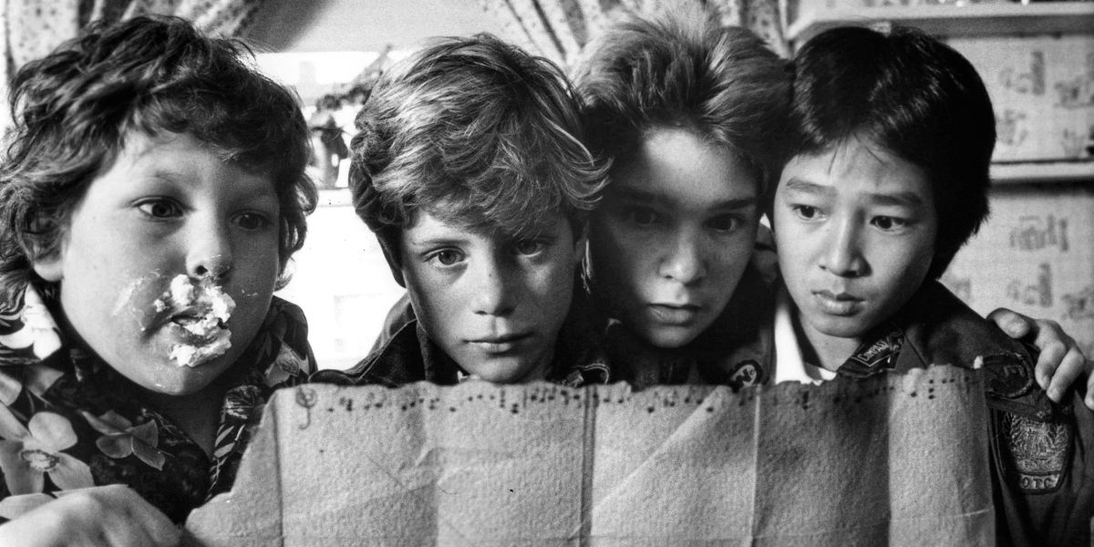 Corey Feldman, Sean Astin, Ke Huy Quan, and Jeff Cohen reading a treasure map in a scene from the film “Goonies,” in 1985 | Source: Getty Images