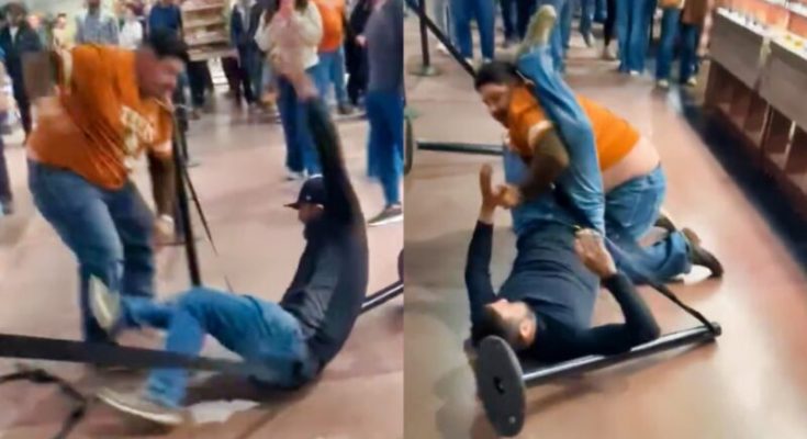 The sporting goods retailer opened its doors at its new branch on Saturday, but things hardly went as smoothly as planned, as a wild brawl erupted between a group of men, one of whom wore a Longhorns jersey.