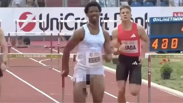 During a 400m hurdles event at the Ostrava Golden Spike meet in Czechia the 24-year-old runner suffered a rather awkward wardrobe malfunction that he couldn’t quite fix during his race.