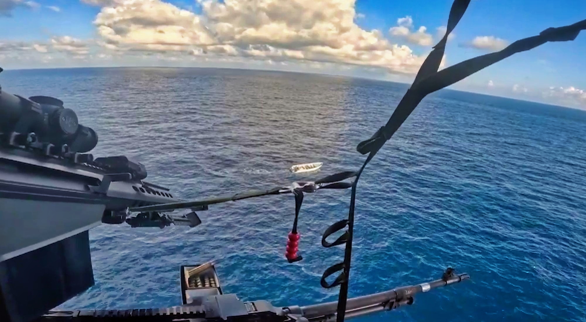 In the video, the drug boat speeds through rough waves while a Coast Guard helicopter moves in. A sniper from the Helicopter Interdiction Tactical Squadron takes aim and fires from the air. The shots hit the boat’s engine, stopping it in the water. Coast Guard crew members then closed in and boarded the boat.