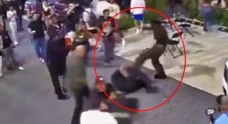 The video shows that the man was the one being jumped. Security guards quickly jump into the fight to attempt to break it up. At one point, one of the security guards falls, and Antonio Brown gets off the ground and kicks him.